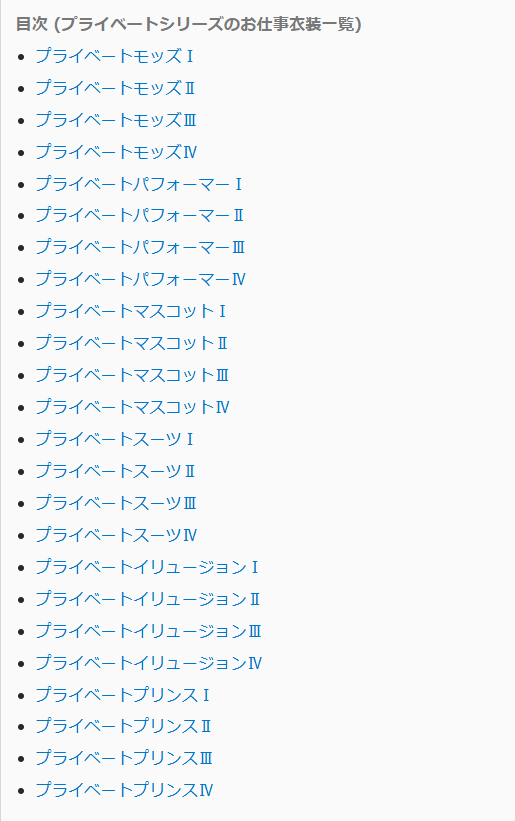プライベートシリーズ: これはアイドルたちが特定のお仕事で使用する衣装で、各アイドルに合わせたデザインが施されています。プライベートシリーズには、スーツやパフォーマー、イリュージョンなどのスタイルがあります。